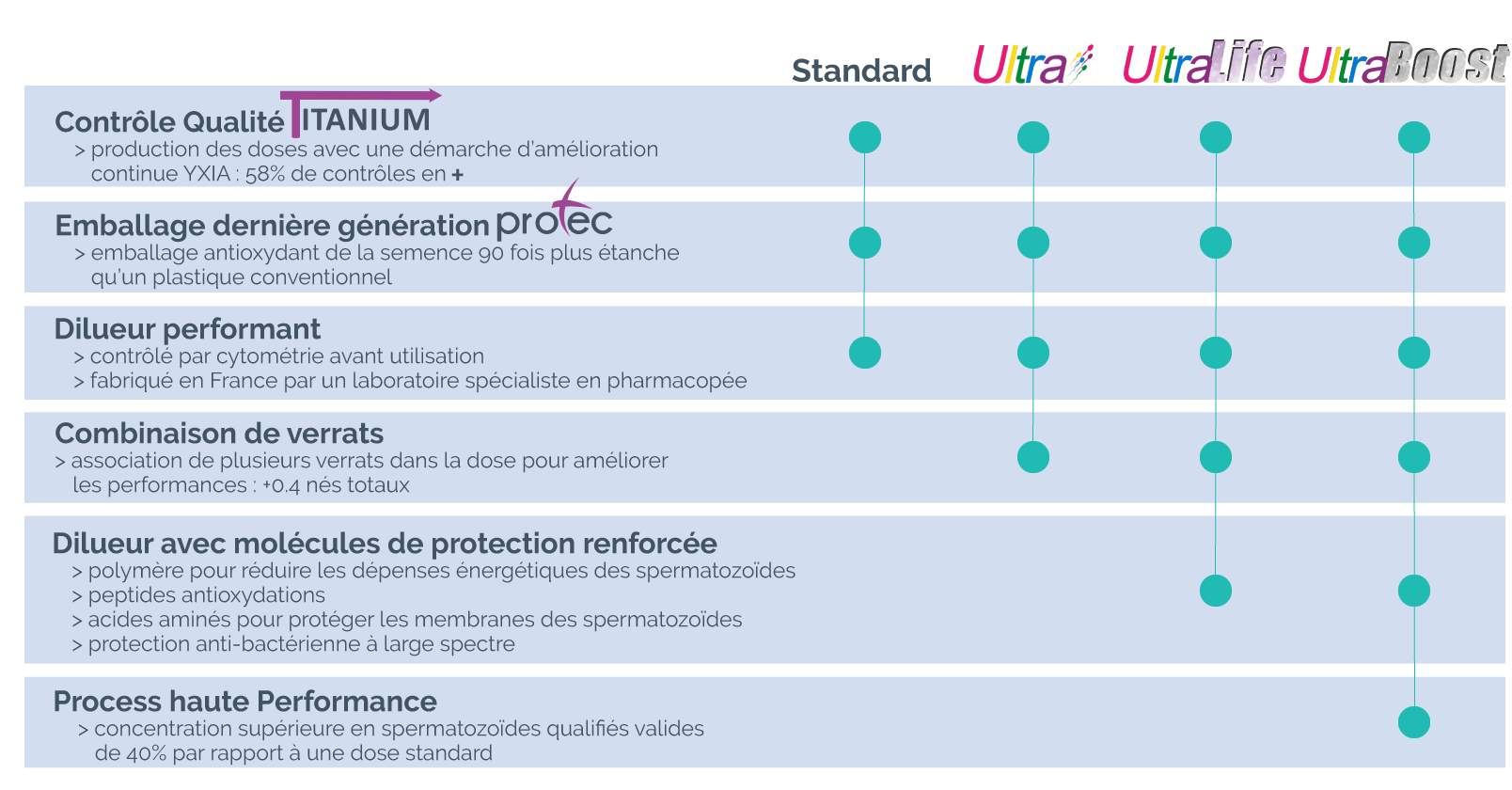 Parce que les éjaculats ne contiennent pas tous les mêmes proportions de molécules favorables à la reproduction. Même si toutes les spermatozoïdes sont qualifiées conformes, d’autres éléments entrent en compte dans la reproduction. La technologie Ultra permet d’intégrer ces autres éléments pour améliorer la performance globale de votre élevage.