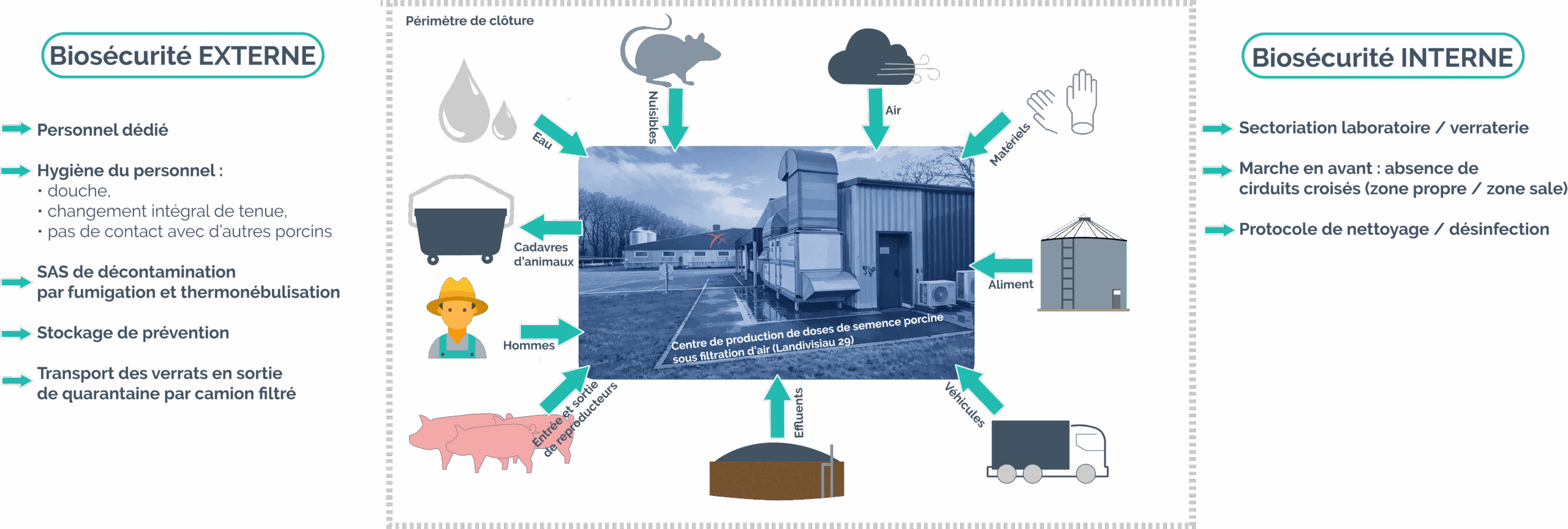 À ce jour, 92 % des doses de semence porcine produites par YXIA sont élaborées dans des environnements à air filtré, garantissant un niveau élevé de maîtrise du risque sanitaire. Les 8% restants sont produits dans un CIA implanté dans une zone où il n’y a pas de production porcine dans un rayon de 20 km à la ronde.